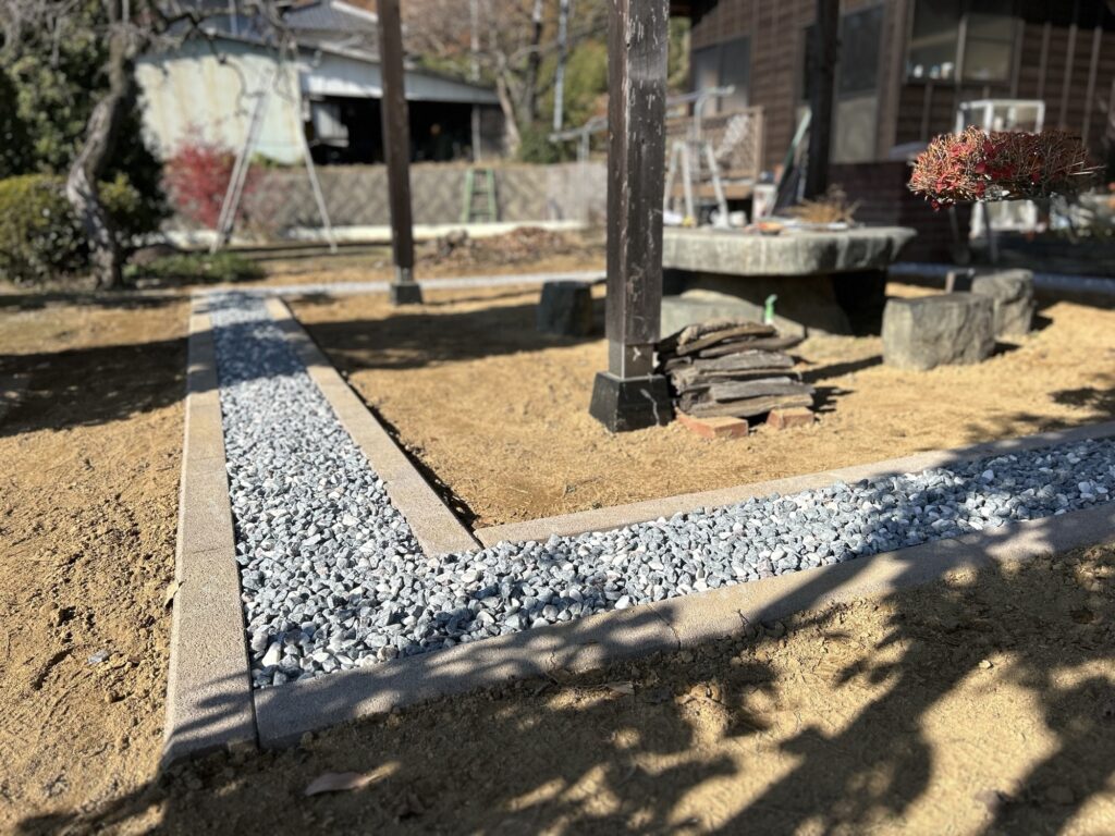 先日、工事をさせて頂きました。エスビックのスマートエッジで縁取りをし、中央に五色砂利。ホームセンター等で売っている縁石と違い和風な質感でとても落ち着きある仕上がりになりました。